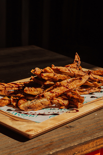 8 alitas de pollo marinadas en BBQ a las que añadimos salsa de queso cheddar y polvos de torrezno y bacon